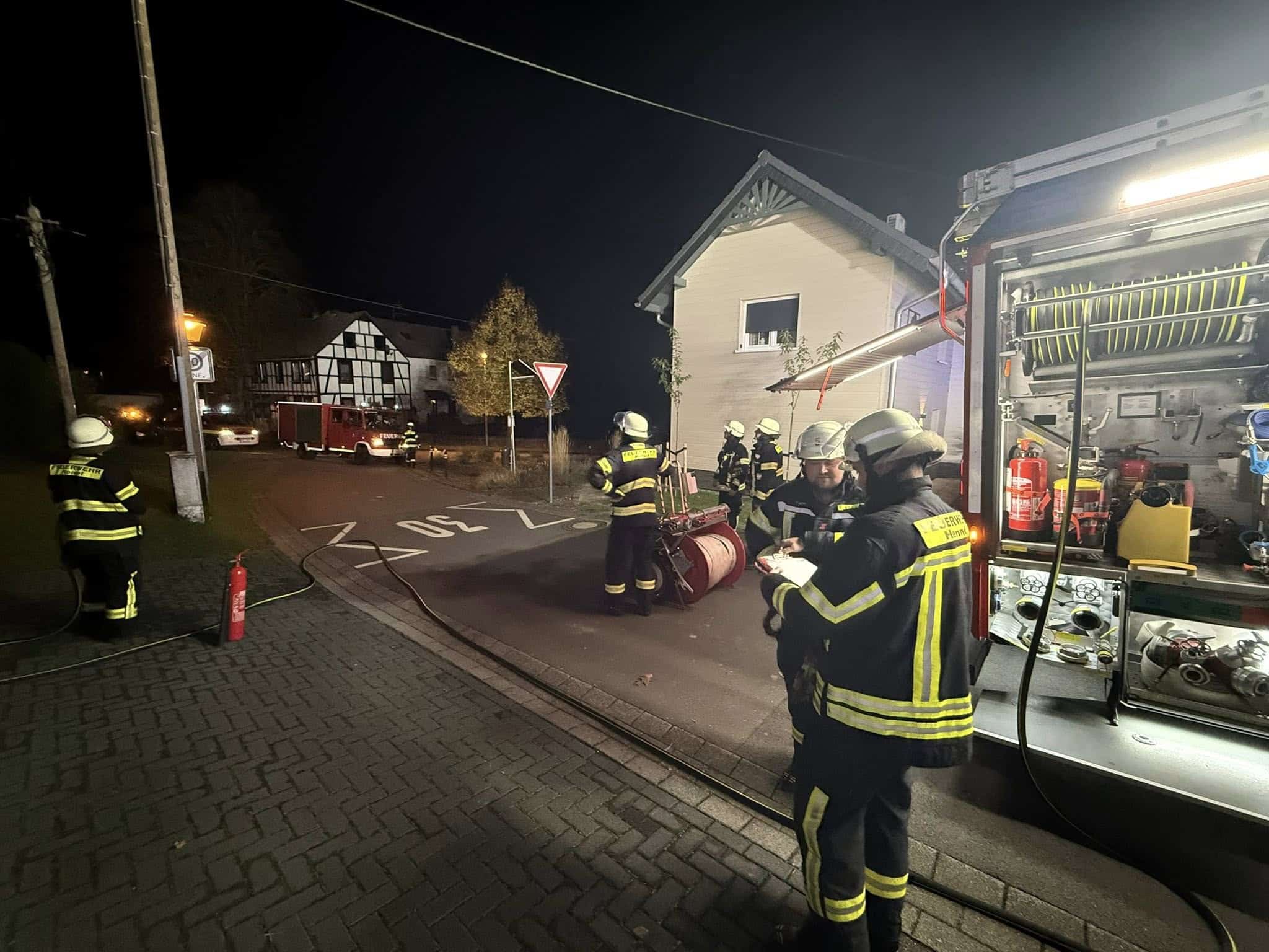 | Information: | Ein Dachstuhlbrand ereignete sich in den Nachtstunden des 20.09.2025 in der Uferstraße im Hennefer Zentrum. Gebrannt hatte es in einem Einfamilienhaus. Das Gebäude wird gerade in Holzrahmenbauweise aufgestockt. Wegen dieser Erweiterungsarbeiten war das Objekt eingerüstet und befand sich im Bereich der Aufstockung im Rohbau. Die Außenwände waren im Rahmen der Bauarbeiten mit Holzfaserdämmplatten versehen worden. Gebrannt hatten diese Holzfaserdämmplatten auf einer Fläche von ca. 20 qm. Bewohnt wird das Gebäude von einer 5köpfigen Familie. Darüber hinaus befand sich gerade ein Übernachtungsgast der Kinder im Haus. Die Bewohner des Hauses hatten das Feuer selbst bemerkt. Die 14jährige Tochter – das mittlere von 3 Kindern – wurde durch leise Knistergeräusche geweckt. Sie benachrichtigte ihre Eltern, die dann auf das Feuer und die Rauchentwicklung aufmerksam wurden. Die Familie verließ mit den 4 Kindern sowie 2 kleinen Hunden in Chihuahua – Größe unverzüglich das Haus und alarmierte die Feuerwehr. Ferner setzen sie noch mehrere Fahrzeuge weg, damit diese den Löscharbeiten nicht im Wege stünden. Diese Entscheidung erwies sich als goldrichtig, da die Drehleiter sonst nicht an die Brandstelle herangekommen wäre. Bei Eintreffen der Feuerwehr befand sich somit niemand mehr im Haus. Vermutlich hat das außergewöhnlich gute Gehör der 14jährigen Tochter die Familie gerettet. Neben der Familie wurden Nachbarn durch den Brandgeruch auf das Feuer aufmerksam und alarmierten ebenfalls die Feuerwehr. Wegen des gerade stattfindenden Stadtfestes wurde durch die Feuerwehr Hennef ein ständig besetzter Brandsicherheitswachdienst (BSW) organisiert. Dieser BSW hält sich außerhalb von Alarmierungen auf der Feuerwache der Löscheinheit Hennef in der Theodor-Heuss-Allee auf. Die Uferstraße befindet sich im Einzugsbereich des BSW, so dass die nur ca. 600m entfernt liegende Einsatzstelle schnellstens innerhalb weniger Minuten erreicht werden konnte. Das ersteintreffende Fahrzeug war das HLF 20, welches mit dem Personal des BSW voll besetzt war. Weitere Fahrzeuge wurden mit nachkommenden Kräften besetzt und erreichten ebenfalls schnell die Einsatzstelle. Neben der Löscheinheit Hennef wurde die Löscheinheit Söven alarmiert, die ebenfalls in die Einsatzmaßnahmen involviert war. Das langsam voranschreitende Feuer in den Dämmplatten löste eine enorme Rauchentwicklung aus. Bereits weit vor Eintreffen der Feuerwehr war der Brandrauch wahrnehmbar. Zur Brandbekämpfung wurden insgesamt 2 C-Rohre vorgenommen. Mit einem C-Rohr im Außenangriff wurden die Holzfaserdämmplatten abgelöscht. Ein weiteres C-Rohr wurde über die Drehleiter vorgenommen. Ferner hatten die Einsatzkräfte ein weiteres C-Rohr in den Innenbereich verlegt, mussten dieses aber nicht mehr einsetzen. Insgesamt gingen 3 Trupps unter Atemschutz zur Brandbekämpfung vor. Nachdem das Feuer in der Gewalt war, mussten weite Teile der Fassade entfernt werden, um an alle Glutnester zu gelangen. Diese Arbeiten waren äußerst aufwendig. Eine Wärmebildkamera half bei der Ortung der Glutnester. Einsatzleiter war Stadtbrandinspektor Markus Henkel. 50 Einsatzkräfte der Löscheinheiten Hennef und Söven waren vor Ort. (tv) (Veröffentlichung Bilder auf Homepage mit freundlicher Genehmigung des Eigentümers des Schadenobjektes) |